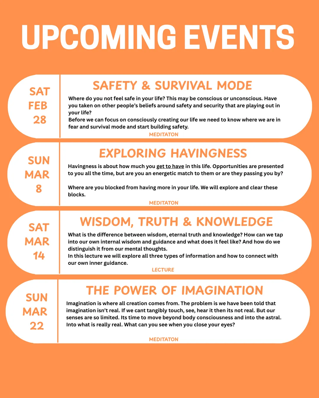 Join the meditations and masterclasses that run weekly via the WhatsApp community where you can also meet others on the same journey.